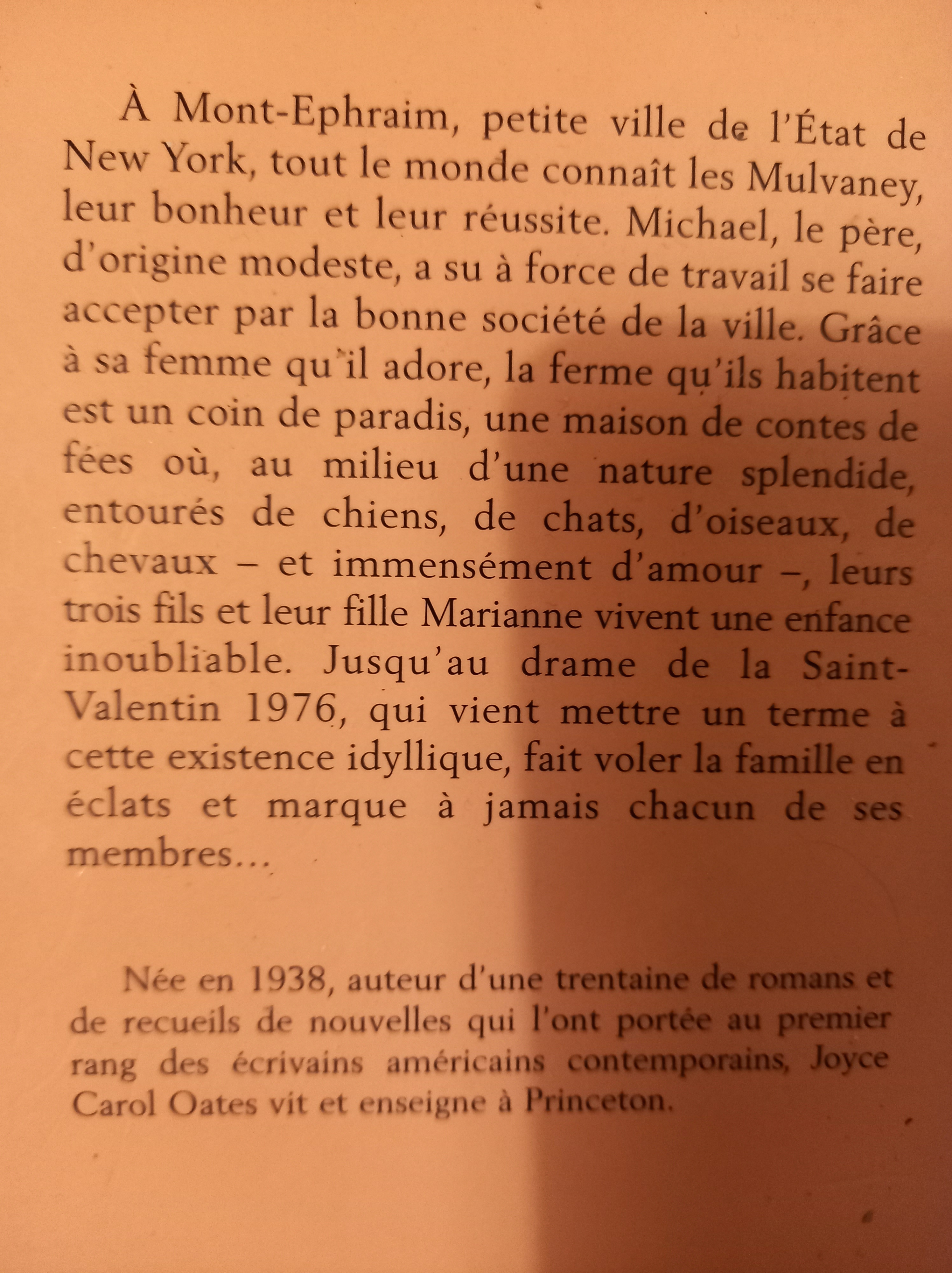 Quel roman ! Encore une fois l’immense Joyce Carol Oates, qui m’avait déjà par deux fois, absolument renversée, avec « Blonde » et « Les chutes » , me bouleverse, à nouveau, avec ce roman et m’époustoufle par tant de talent. J’ai dévoré cette histoire de 800 pages, avec avidité, passion, souvent le coeur froissé de tristesse, les yeux bordés de larmes devant le récit de ce drame personnel, qui va se métamorphoser sans retour possible en drame familial, et faire exploser chaque vie de la famille Mulvaney, en mille morceaux. Une lecture qui remue et qui vous prend aux tripes, tant les personnages sont attachants, dont l’inoubliable Marianne, tant les jours heureux sont si bien retranscrits, que lorsque l’on assiste au délitement de cette famille, la lecture devient cruelle et déchirante. C’est Magnifique !